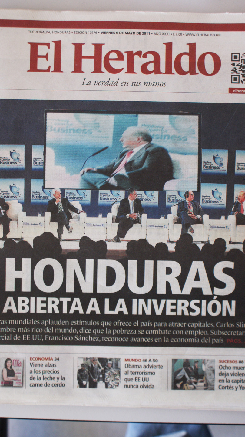 Concluyó ayer (6/5) en la ciudad norteña de San Pedro Sula el evento empresarial “Honduras is open for business”, en el que participaron unos 1,500 empresarios de 55 países, para examinar los 147 proyectos presentados por el régimen hondureño. Una inversión que supera los 14 mil millones de dólares. Un plato demasiado apetitoso para dejarse distraer por la sangre que corría en las calles y las plantaciones del país.